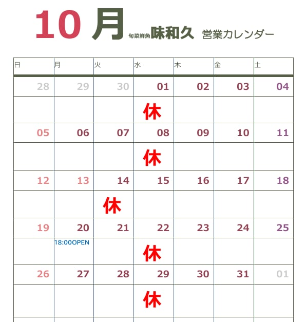 さて、味和久の営業は、ほぼ通常通りの水曜定休日となっております。今月はイレギュラーは第3週。10/14(火)がお休み、15(水)が通常営業となります。