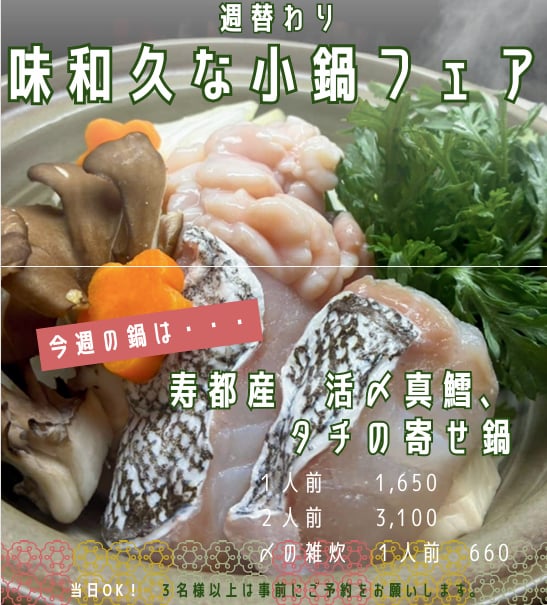 暑い夏がすっかりどこかへ行ってしまいました。鍋の季節です!ワイワイつつくお鍋も良いですが、お二人さまにちょうど良い小鍋をスタートです。お鍋の他のお料理も食べたいという方にはもってこい!ご予約なし、当日オーダー可能です。ちなみに、お一人様・・・も!?OKです!!!お鍋の中身は週替わりとなっておりますが、まずは活〆のいい真鱈を仕入れましたので