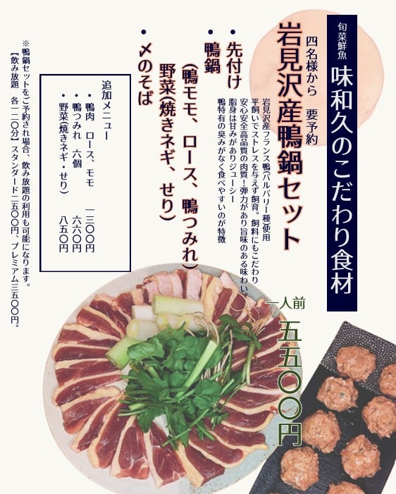 こだわり食材推しの新メニュー。高級食材とされる岩見沢産のフランス鴨を使用した鍋スタートです。先付け、〆のそばがついて、お一人様5,500円。四名様からのご予約となります。平飼いされた鴨の肉質は脂が少なく弾力のある赤身が多め、臭みが無くまろやかで旨い!セットご予約のお客様は、飲み放題のご利用も可能になります。【飲み放題 120分】スタンダード2,500円、地酒がついたプレミアム3,500円。詳細はお問い合わせください。011-251-0380