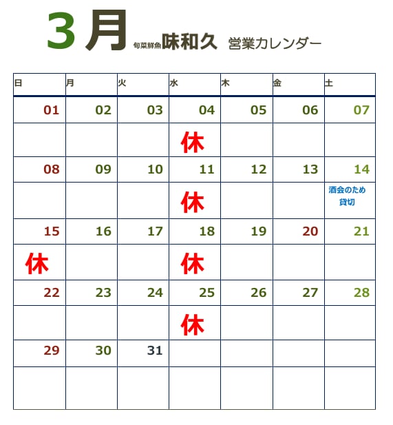 定休日も定番の水曜日ですが、3/15(日)は臨時休業をいただきます